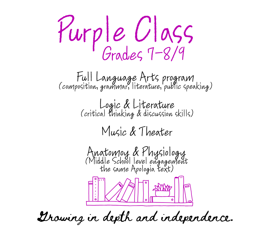 We offer afternoon classes for Middle School that would otherwise be difficult to offer at home. This year, students will participate in a Music & Theater class (in combination with the High School students), Logic & Literature (using critical thinking skills about culture and literature), and Science (using the same Anatomy & Physiology book as the elementary level, with Middle School level work and engagement).